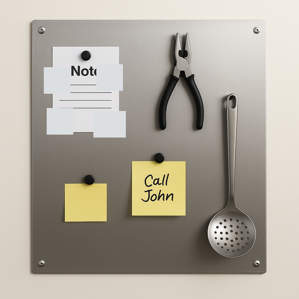 La plaque se pose sur mur brut, cloison ou crédence. Vous fixez avec vis, rails ou adhésif adapté. Ensuite, vous contrôlez l’alignement. Ainsi, le panneau devient un vrai tableau magnétique inox.